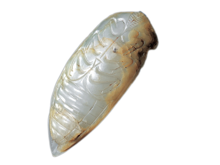 在各种玉制昆虫里,玉蝉的数量最多,其制作的历史可追溯到我国的史前时代。在古人心目中,蝉栖于高枝,饮甘露而生,是一种性情高雅的生物。《史记·屈原贾生列传》记载:“蝉蜕于浊污,以浮游尘埃之外,不获世之滋垢。”正因蝉寓意高洁,用玉雕刻成,佩戴在身上,或饰在冠上,既代表身份地位,又显示清雅高尚。除了这种佩蝉和冠蝉之外,还有琀蝉。古人认为蝉能蜕化不死,人死了如同蝉变成蛹,来年又可复生,所以死后在口中含蝉,期望自己像蝉一样能蜕化再生。人们生前往往将蝉作为佩饰戴在身上,死后以蝉随葬,作为追求不朽获得新生的寄托,因而玉蝉自古是玉雕的重要题材之一。