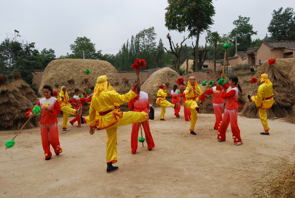 冬日的早晨,斜坡村的麦场上,返乡过年的打工者在镇政府组织下,穿戴整齐,手执鞭杆,在二胡、钹、鼓的伴奏下再次舞起来,一旁有专人演唱历时百年的《八渡神仙》:一渡神仙汉钟离,头挽抓髻不整齐;二渡神仙吕洞宾,头顶青丝一顶巾;三渡神仙张果老,悠悠骑驴过仙桥……