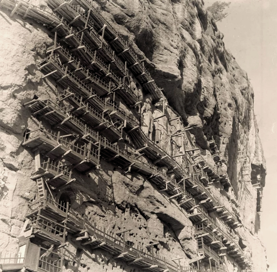 关于麦积山石窟的古建筑。王子云对麦积山石窟悬于半空的宫殿式古建筑极为惊叹。全国范围内,今日能见到的古建筑,最早者仅到唐代,而麦积山上七佛阁是北朝后期北周时代的遗物。这是一座七开间的宏大宫殿式建筑。其西壁的牛儿堂,是一座三开间的高崖殿堂,也是同一时代或稍晚的隋代建筑,其檐柱间一斗三升的人字披大型铺作斗拱,是那一时代建筑的主要标志。“像这样规模宏大的古宫殿式建筑,在全国说来恐是仅见的孤例。”它们高据离地面二百多米的悬崖峭壁,可以想象当初斩山架梯攀登的巨大工程,或真如文献所载“自平地积薪至于崖巅”才能进行凿造,亦未可知,这体现了古人的伟大才智和魄力。