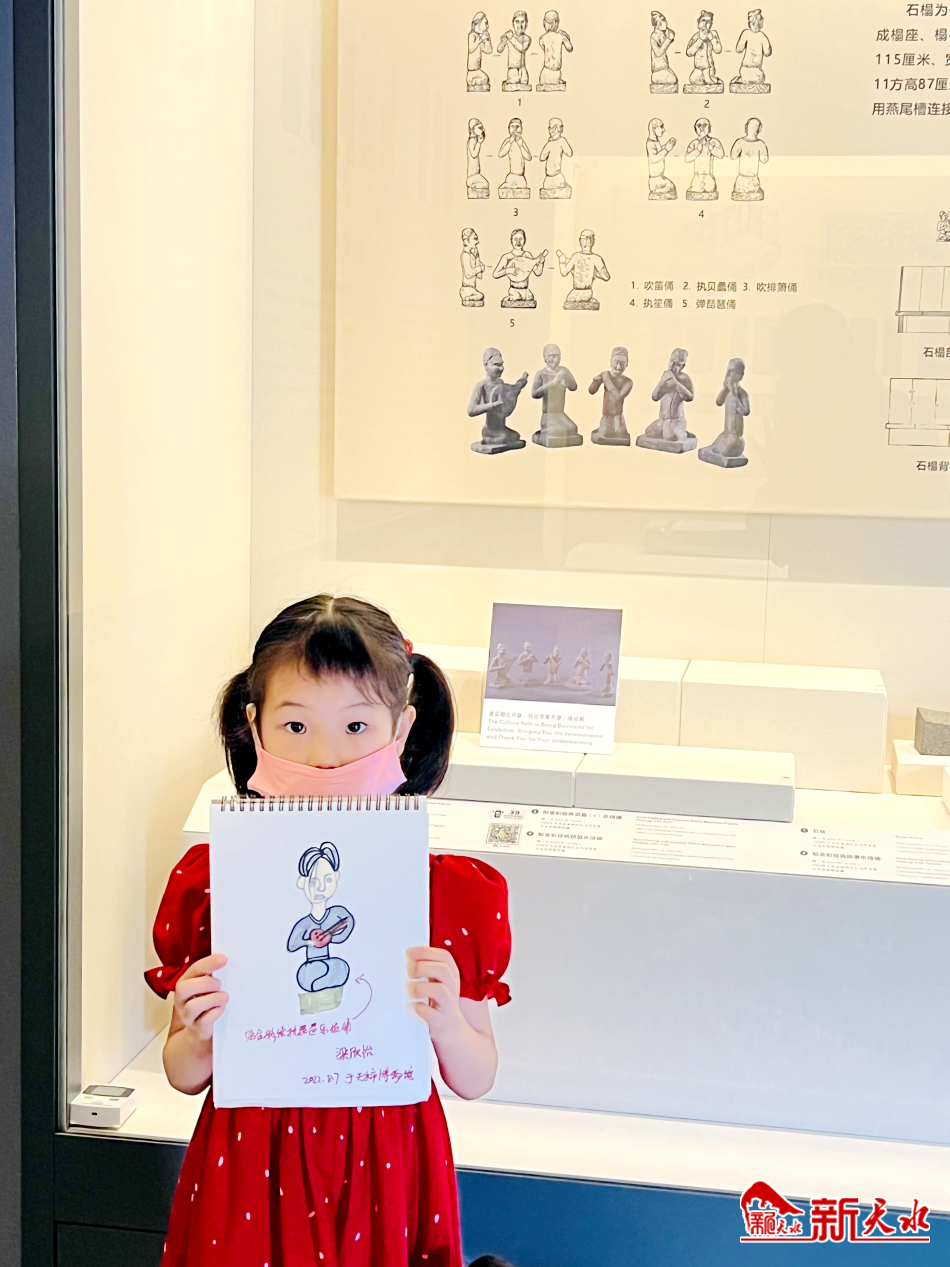 聆听完讲解后,小艺术家们围坐在展厅前仔细观察,与国宝面对面进行实地写生。在专业绘画老师的指导下通过引、观、巧、绘、创五大步骤进行艺术启发,解读国宝身上的美学密码,大家以水墨、素描等方式从不同角度勾勒出石棺床整体轮廓、屏风画内容、伎乐俑和神兽形象,并融入自己的创意想法进行上色渲染,为自己的作品赋予了更多灵性。当孩子们拿着自己绘画的作品时,脸上洋溢着收获的成就感。