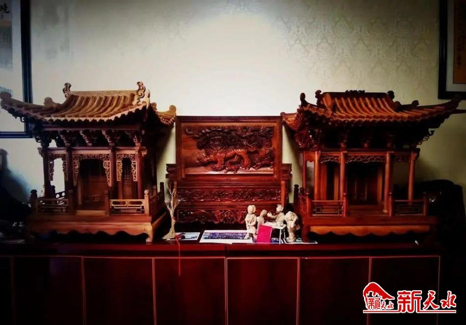 武山农村不少农户家都有“神主厅”,也叫“主厅”“先人堂”或“主堂”,主要用来摆放祖先遗像、家族族谱,以此来表达对祖先的缅怀与追思。关学田在此类作品的创作中,以当地人喜闻乐见的“酸梨木”为原材料。“家里能有梨木家具,这是武山人引以为傲的。咱们武山出产的酸梨木,木质光泽度高、密度好,包浆效果也非常不错。”关学田介绍说,自己在设计制作“神主厅”时,主要是借鉴运用传统古建筑榫卯结构等制作工艺,以单檐歇山顶结构为基础,等比例微缩精制而成,通过高浮雕、镂空、圆雕等诸多制作工艺及其技法的熟练运用,从而保证了作品拥有更高的观赏性和艺术价值。