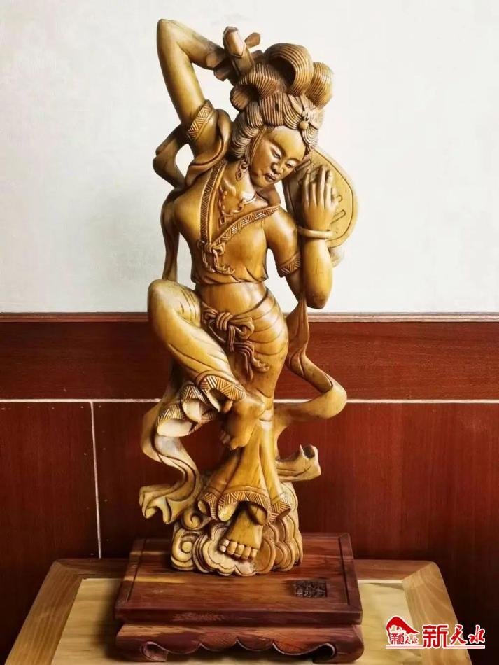 由关学田设计制作的木雕作品《东方韵》,曾在第十五届甘肃省工艺美术百花奖评选中获得创作创新二等奖。这件木雕人物作品,为充分展现人物的立体形态,考虑到制作工艺的特殊性,关学田在选材上优先选用了当地出产的红桦木。同时,受到敦煌飞天的人物形态启发,他又借鉴了伎乐俑的部分元素,使作品在整体形态上体现出东方女性特有的温柔、灵动的自然之美。在制作工艺技法上,关学田主要采用了圆雕技法,无论从局部还是到整体,都能给观众一种赏心悦目的美感。