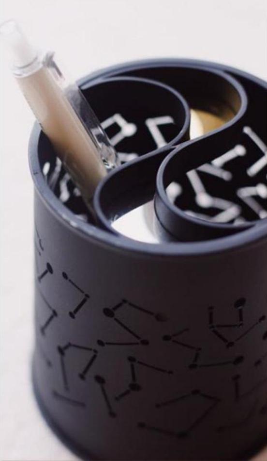 千秋岁笔筒,创意来源于星云图里的三垣与伏羲八卦图。流动交错的星辰线构成浩瀚无垠的星空,镂空的黑色筒身给人神秘之感。金属材质带来的华丽光泽与光滑触感凝结了岁月往事,时尚艺术巧妙地构建案上文化的最佳载体,形成桌面上的城市现代雕塑艺术。