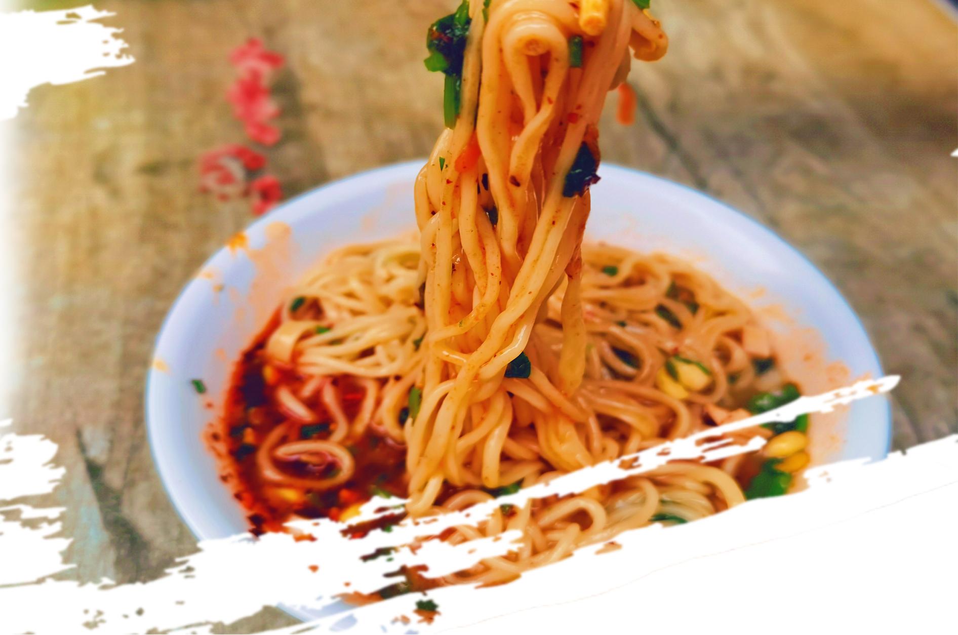 鲜美的汤也需有灵魂的料,亮红的油泼辣子是一碗面的点睛之笔。担担面里的油泼辣子选用的是武山本地产的辣椒,辣味温良,辣中带鲜。将油烧至五成热的时候加入生姜、洋葱、葱段后继续将油烧热煎出香味后捞出残渣,油温太高辣椒面会焦煳,油温太低又激发不出油泼辣子的芳香,恰到好处的油温才是激发油泼辣子香味的关键。“嗞啦”一声脆响,热油浇到辣椒面上,瞬间,油泼辣子的香味弥漫整条街。再备好蒜汁、四门香醋、芥末水,至此,幕后的准备工作就绪,只等食客前来开启台前的精彩演绎。