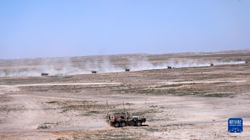 在“西部·联合-2021”演习第一次实兵实装实弹合练中,野战救护力量为联合任务部队提供保障(2021年8月5日摄)。新华社记者 刘芳 摄