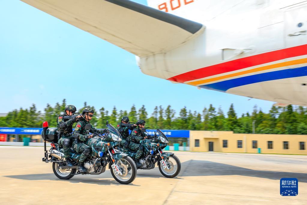 武警上海总队机动第一支队特战某中队组织交通工具反劫持综合演练,特战队员乘坐摩托车接近“被劫持飞机”(2022年8月1日摄)。新华社发(李岩 摄)