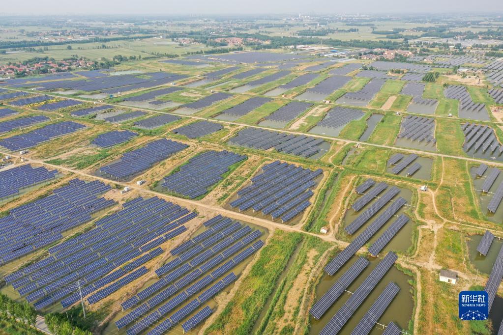 山东高青县湖东村周边建设的千余亩渔光互补养殖场(2022年5月24日摄,无人机照片)。新华社记者 朱峥 摄
