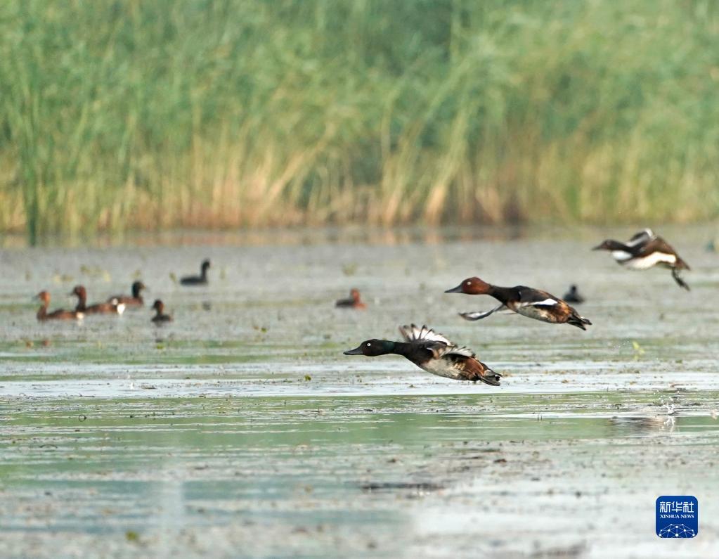 这是在河北白洋淀淀区拍摄的青头潜鸭与白眼潜鸭混群(2022年7月22日摄)。新华社记者 邢广利 摄