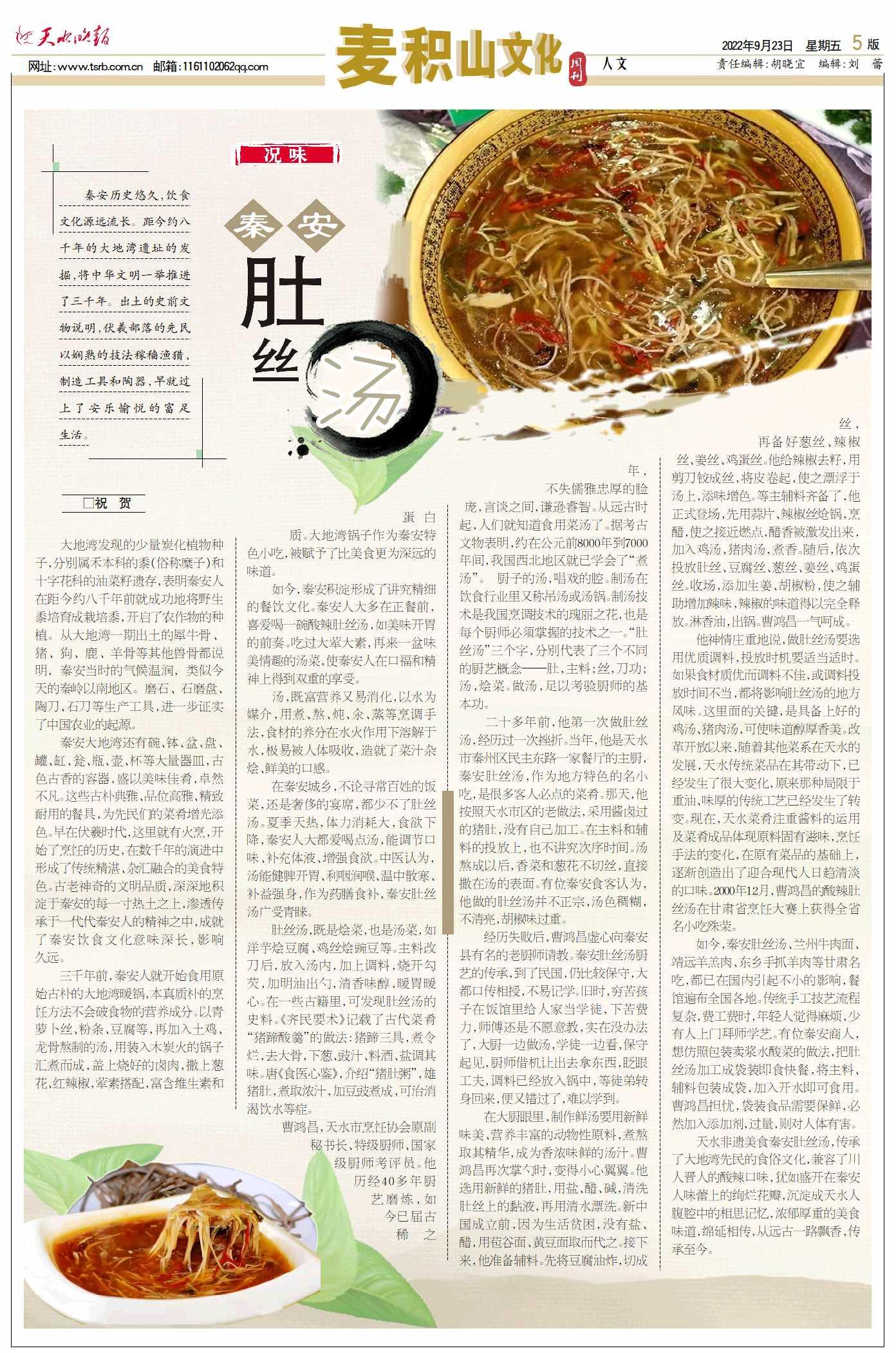 天水非遗美食秦安肚丝汤,传承了大地湾先民的食俗文化,兼容了川人晋人的酸辣口味,犹如盛开在秦安人味蕾上的绚烂花瓣,沉淀成天水人腹腔中的相思记忆,浓郁厚重的美食味道,绵延相传,从远古一路飘香,传承至今。