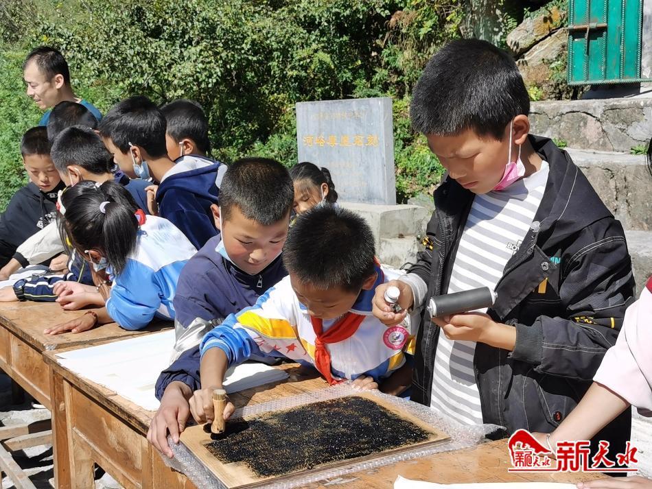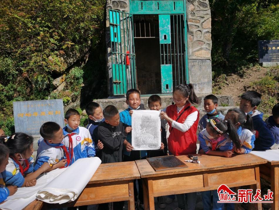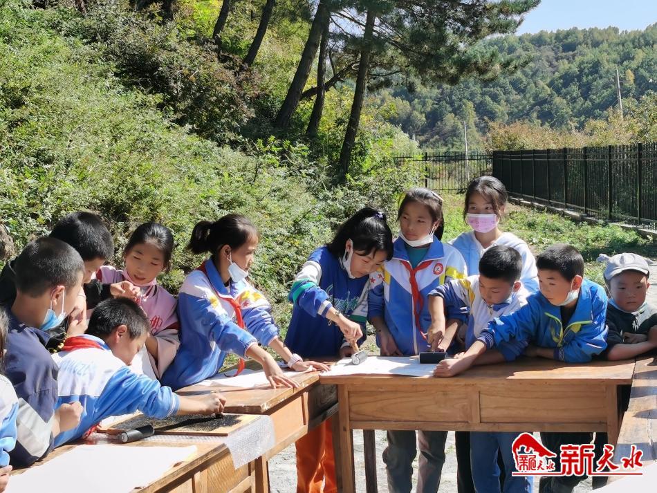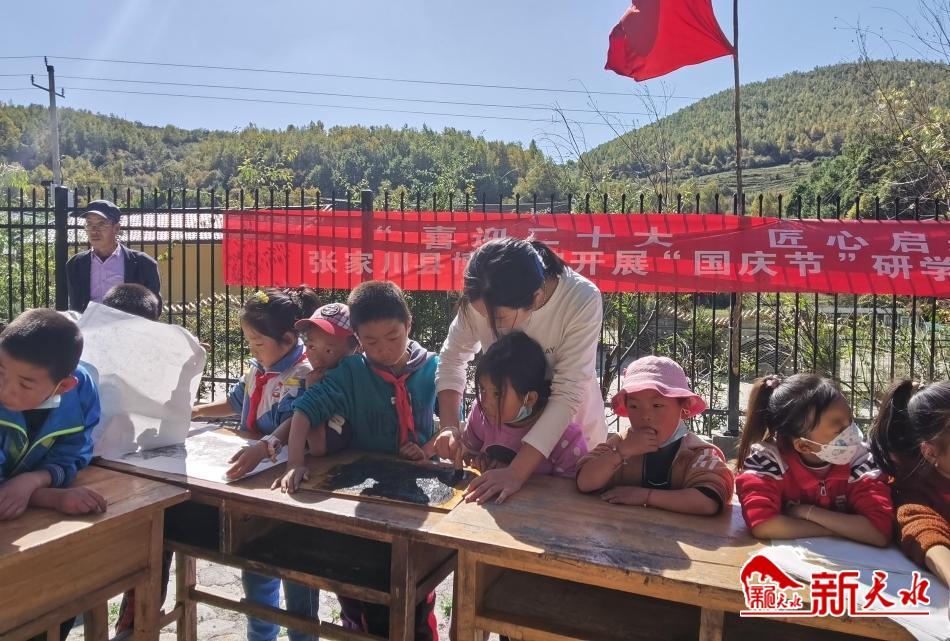 新天水讯 值此国庆节来临之际,为弘扬中国传统文化,加强青少年爱国主义教育,引导青少年感受拓片魅力,传承工匠精神,保护非物质文化遗产,9月28日,张家川县博物馆走进国保单位河峪摩崖石刻,为河峪小学师生举办了一场以“喜迎二十大,匠心启未来”为主题的研学体验社教活动,旨在培养青少年对传统文化和拓片技艺的了解和学习,进而对张家川县国保单位加强宣传和推介。
