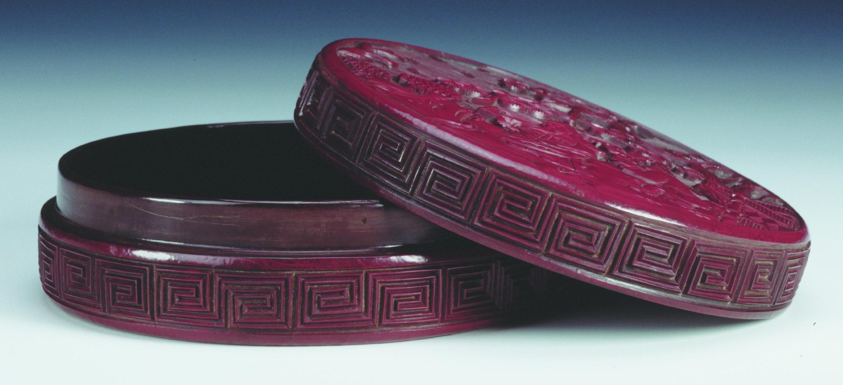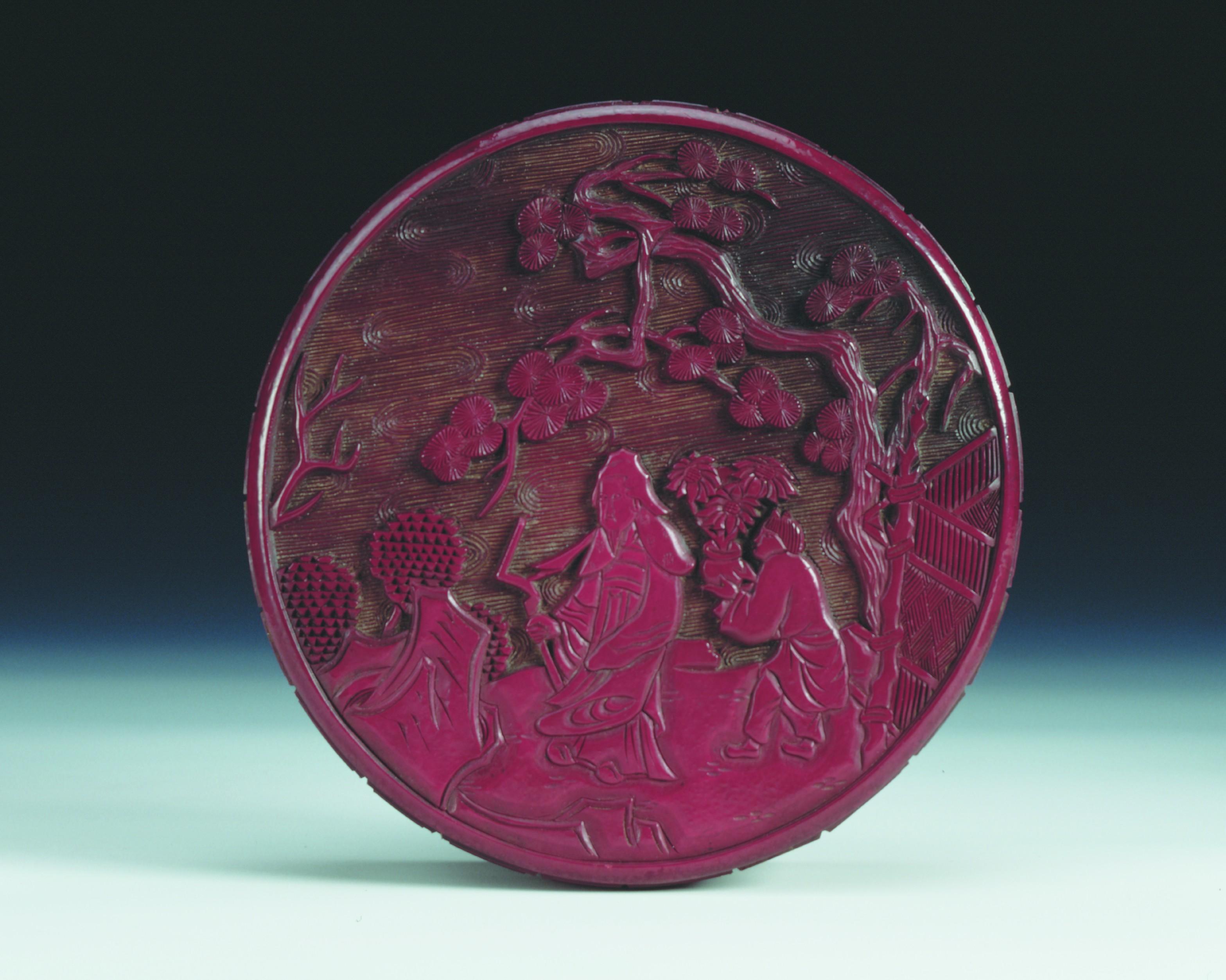 在中国漆工艺中,剔红制品的制作工序可谓最多,制作周期亦为最长,艺术表现力最为突出。雕漆颜色以朱红色为主,鲜红艳丽、喜气洋洋,中国历代帝王有用之点缀宫廷的惯例。剔红的制作方法是常用木灰、金属作胎,将银朱入漆中制成红漆,然后在胎骨上层层刷上红漆,少则八九十层,多的时候可以刷到一二百层,刷到一定的厚度后,再在漆层上进行雕刻。剔红的纹样图案主要是人物故事纹和禽鸟花卉纹两种,人物故事纹多表现文人生活,气氛雅致;禽鸟花卉纹立体感强,刻画精细,表现华丽。人物故事纹是剔红漆器艺术里比较常用的一种图案。人物故事纹剔红既是对文人生活状态的描摹,也是寄托雅致的一种图案。