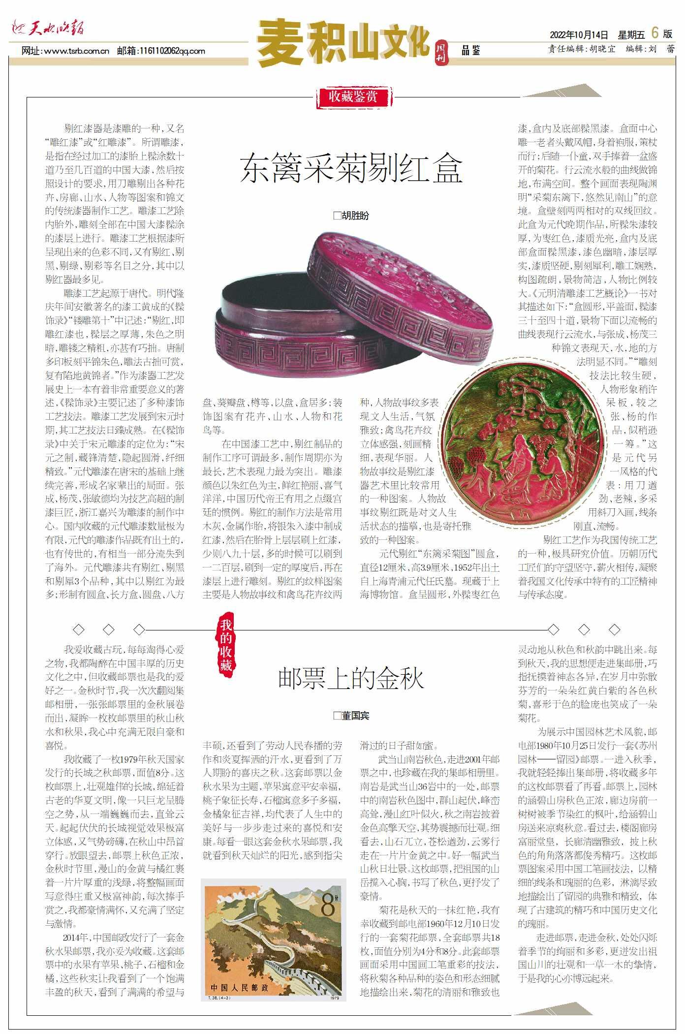 元代剔红“东篱采菊图”圆盒,直径12厘米,高3.9厘米,1952年出土自上海青浦元代任氏墓。现藏于上海博物馆。盒呈圆形,外髹枣红色漆,盒内及底部髹黑漆。盒面中心雕一老者头戴风帽,身着袍服,策杖而行;后随一仆童,双手捧着一盆盛开的菊花。行云流水般的曲线做锦地,布满空间。整个画面表现陶渊明“采菊东篱下,悠然见南山”的意境。盒壁刻两两相对的双线回纹。此盒为元代晚期作品,所髹朱漆较厚,为枣红色,漆质光亮,盒内及底部盒面髹黑漆,漆色幽暗,漆层厚实,漆质坚硬,剔刻犀利,雕工娴熟,构图疏朗,景物简洁,人物比例较大。《元明清雕漆工艺概论》一书对其描述如下:“盒圆形,平盖面,髹漆三十至四十道,景物下面以流畅的曲线表现行云流水,与张成、杨茂三种锦文表现天,水,地的方法明显不同。”“雕刻技法比较生硬,人物形象稍许呆板,较之张、杨的作品,似稍逊一筹。”这是元代另一风格的代表:用刀遒劲、老辣,多采用斜刀入画,线条刚直、流畅。