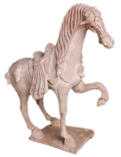 1976年出土于天水市秦州区北山,高42厘米,长41.3厘米。舞马三足立于平板之上,左前蹄悬空向内弯曲,昂首张嘴,摇头摆尾,神态逼真,活灵活现。据悉,舞马表演始于汉代,在唐代达到鼎盛。此件来自西域的陶舞马,作为丝绸之路的“文化使者”,促进了当时的国际友好交流,拓展了丝绸之路的文化内涵,是天水作为丝路重镇的生动实物见证。