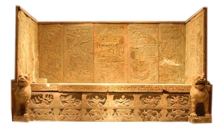 1982年6月出土于天水市秦州区石马坪,长218厘米,宽115厘米,高123厘米。石棺床呈长方形,由大小不等的17方画像石和8方素面石条组成床座、床板和屏风。