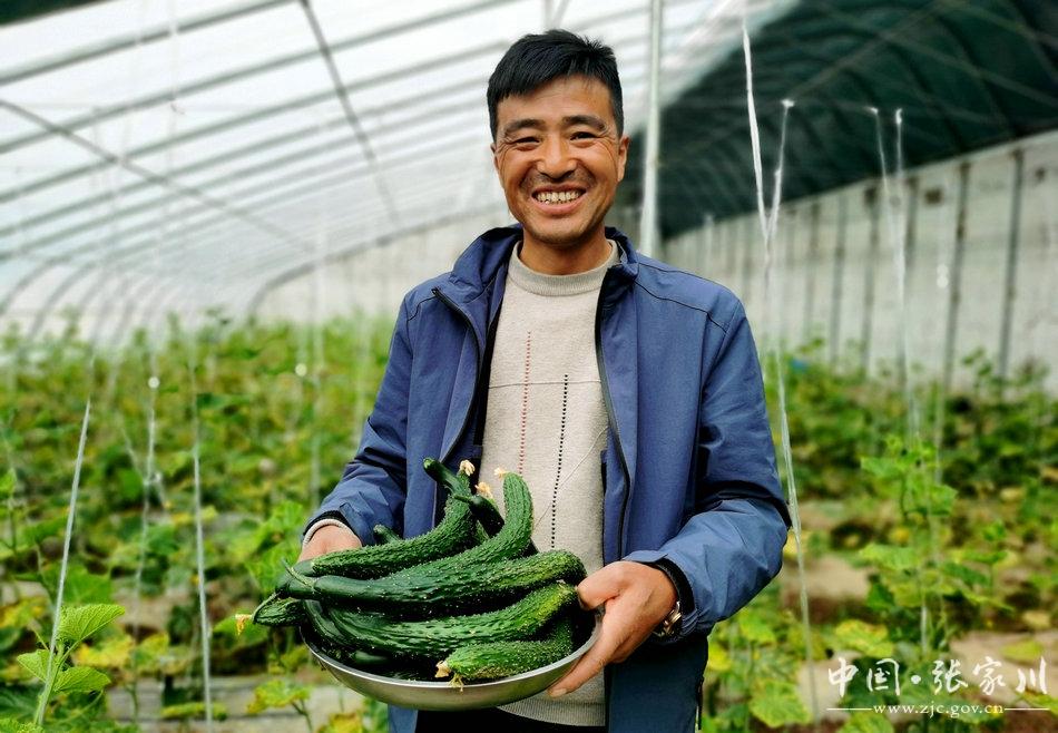 端着刚刚采摘下来的大棚黄瓜,毛建军的脸上洋溢着无比幸福灿烂的笑容。