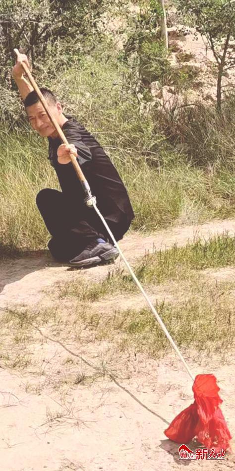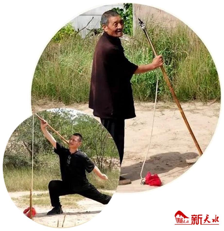 在武山县“武术之乡”暨武林之春武术比赛中,曾有一位老人拿着一根棍与绳、镖组合的罕见武术器械演练,镖随绳走,绳随棍行,棍翻镖扎地中,棍挑镖收身旁,其技艺之精湛,赢得掌声不断,这就是拳师康吼吼的回桩功。