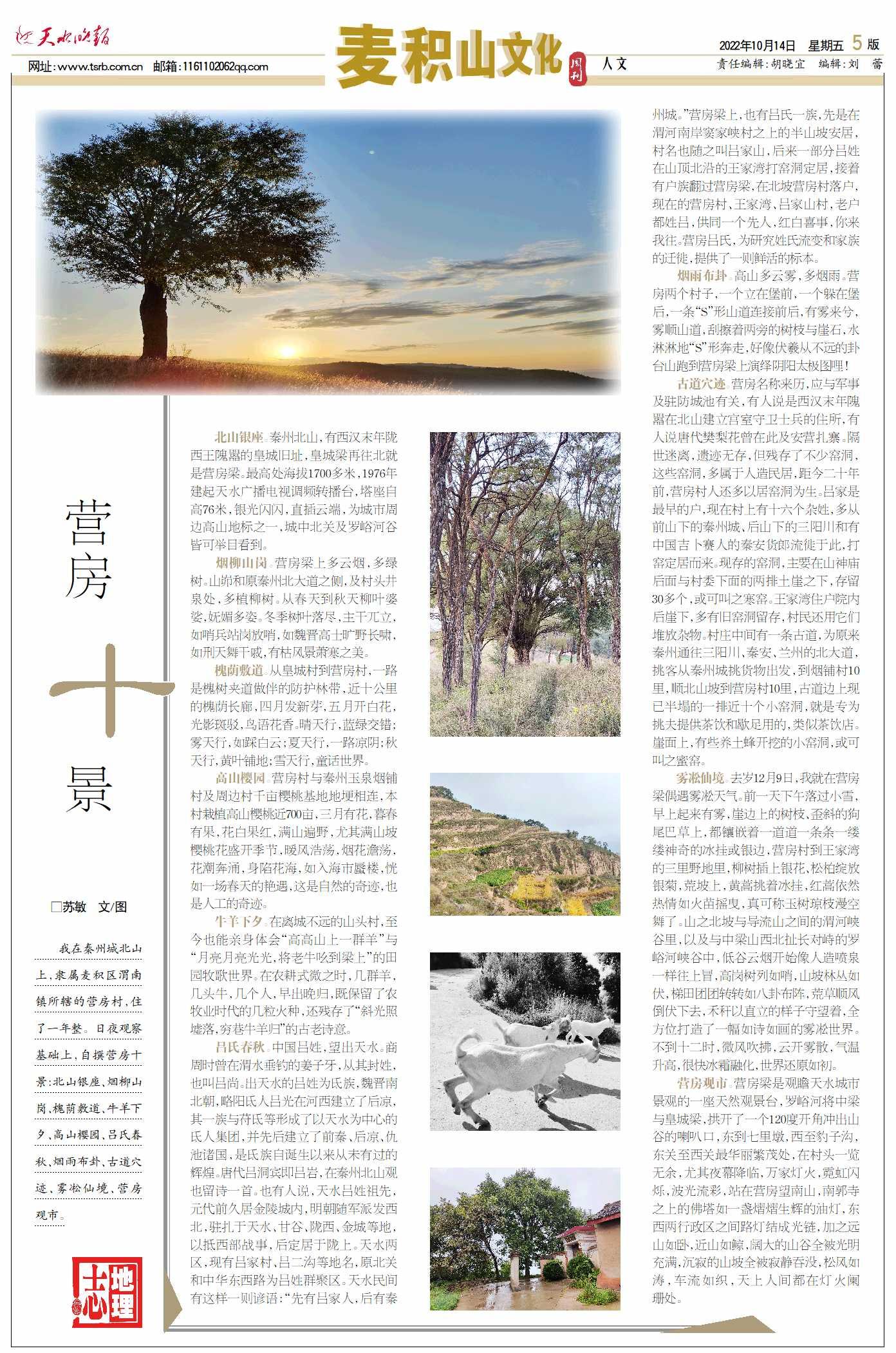 十月中旬,自《天水晚报·麦积山文化周刊》、新天水客户端、“天水时间”推出策划“发现天水乡村之美·营房十景”后,相继被“文旅中国”等多家网站转载,并得到了读者广泛关注,这或许是中国村庄至少是西北小山村以“十景”命名的首例。