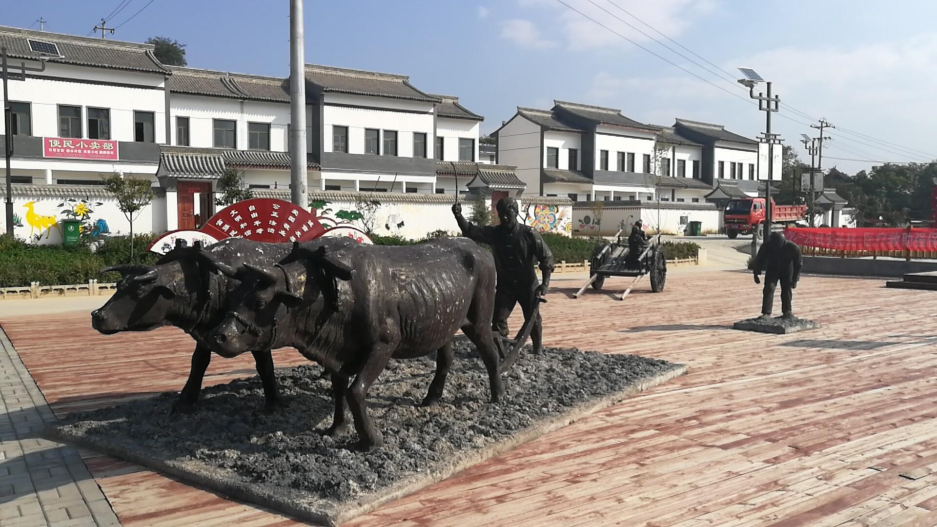 乡村记忆 乡村记忆是几代人关于原生态和美好童年的回忆。李官湾乡村记忆广场就是利用新村正前方一块空地设计建设,主要包括中国农耕标志雕塑——“二牛拉犁”,雕塑原型是村上一对老黄牛。广场建成后,开展农耕文化、陶艺展示、传统射艺、非物质文化遗产展演等活动。同时,围绕“留得住乡愁”,建成农耕文化博览园,家家户户墙壁上都绘制着农民在田间地头劳作的场景,连枷、木杈、簸箕、镰刀、犁等。这里处处焕发着一派怀旧的农耕景象,让人们收获了儿时记忆的同时,真正观赏到乡村振兴的美丽画卷,感受到望得见山、看得见水、记得住乡愁的浓浓乡韵。