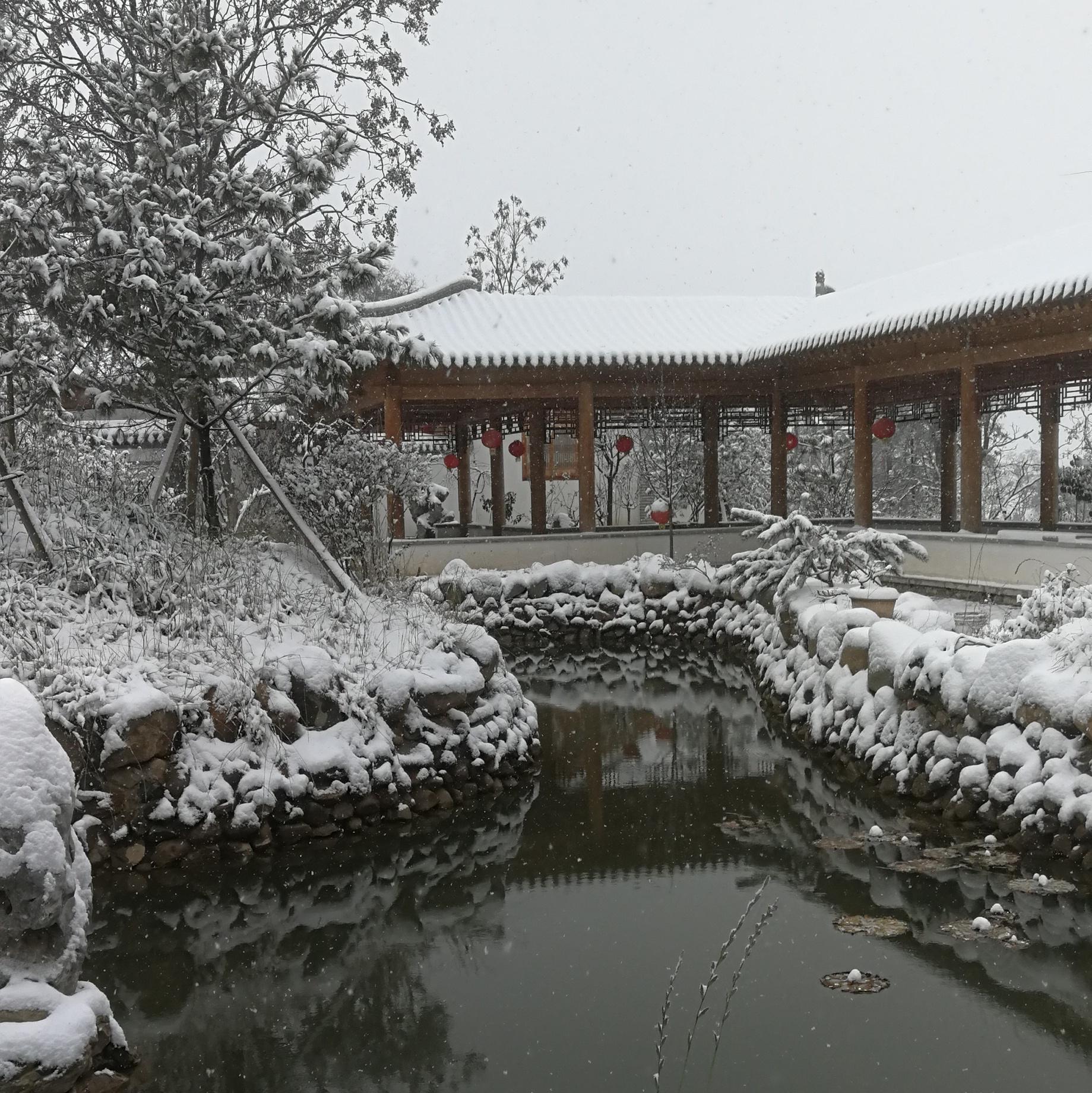 雪落回廊 南山书院为前院后园的中式建筑。后园建九曲回廊一座,冬日落雪之时,可凭栏煮酒,围炉烹茶,尽享冬日之乐。回廊前方,有一荷花池,池旁有老树红豆杉一棵,羽毛枫一棵,金银木、南天竹、碧桃、海棠若干,真是奇珍异草遍布,怪石栅栏林立,有人造假山一座,池边用乱石堆砌,造型独特。入冬之后,盛雪之下,花树在雪中探头,雪映树影、树照花色,“影照凤池水,香飘鸡树风”,唐代诗人张文琮对花树池的精确描写正是南山书院的雪中之景、雪中之境。