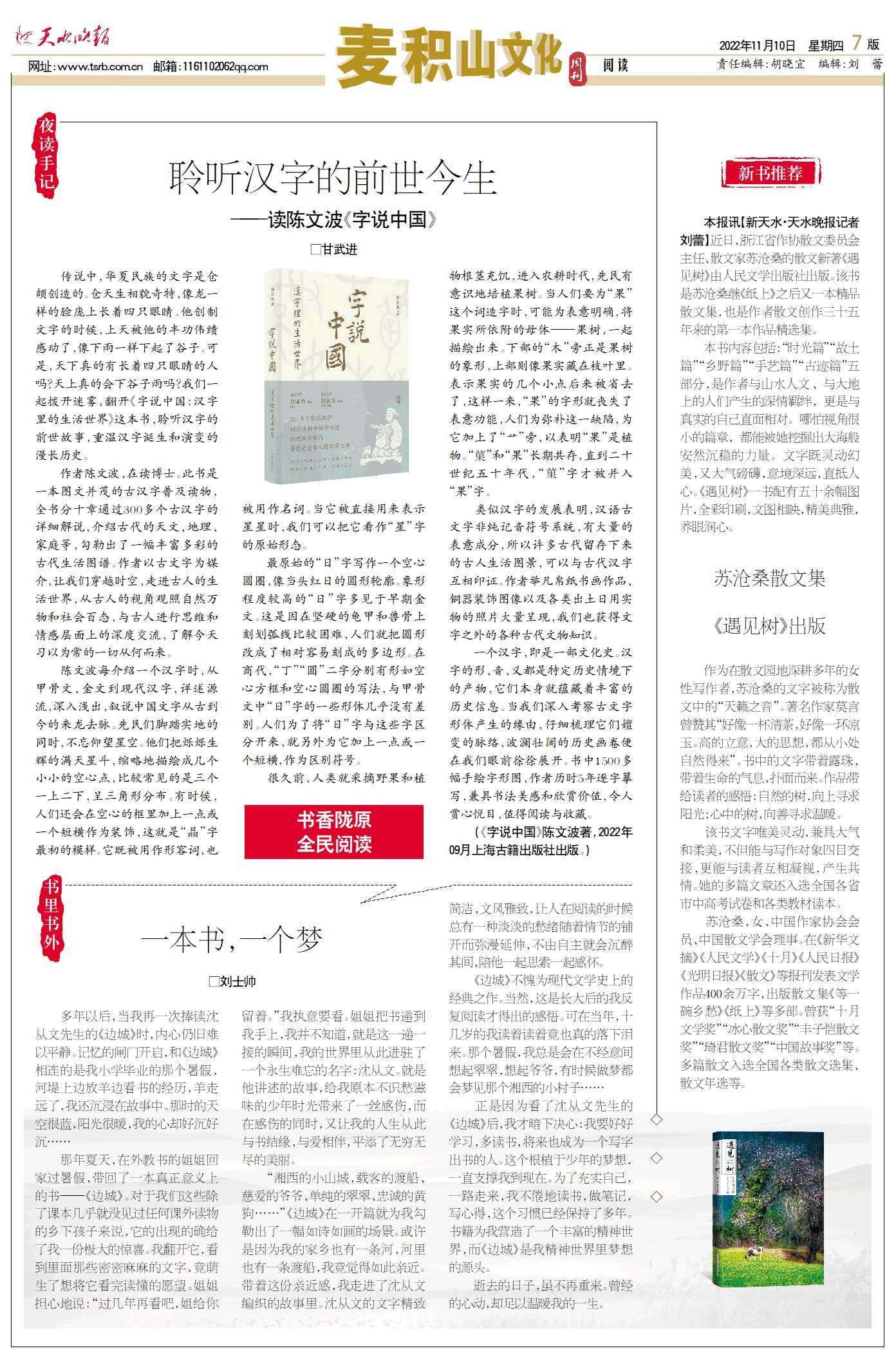 新天水讯【记者刘蕾】近日,浙江省作协散文委员会主任、散文家苏沧桑的散文新著《遇见树》由人民文学出版社出版。该书是苏沧桑继《纸上》之后又一本精品散文集,也是作者散文创作三十五年来的第一本作品精选集。