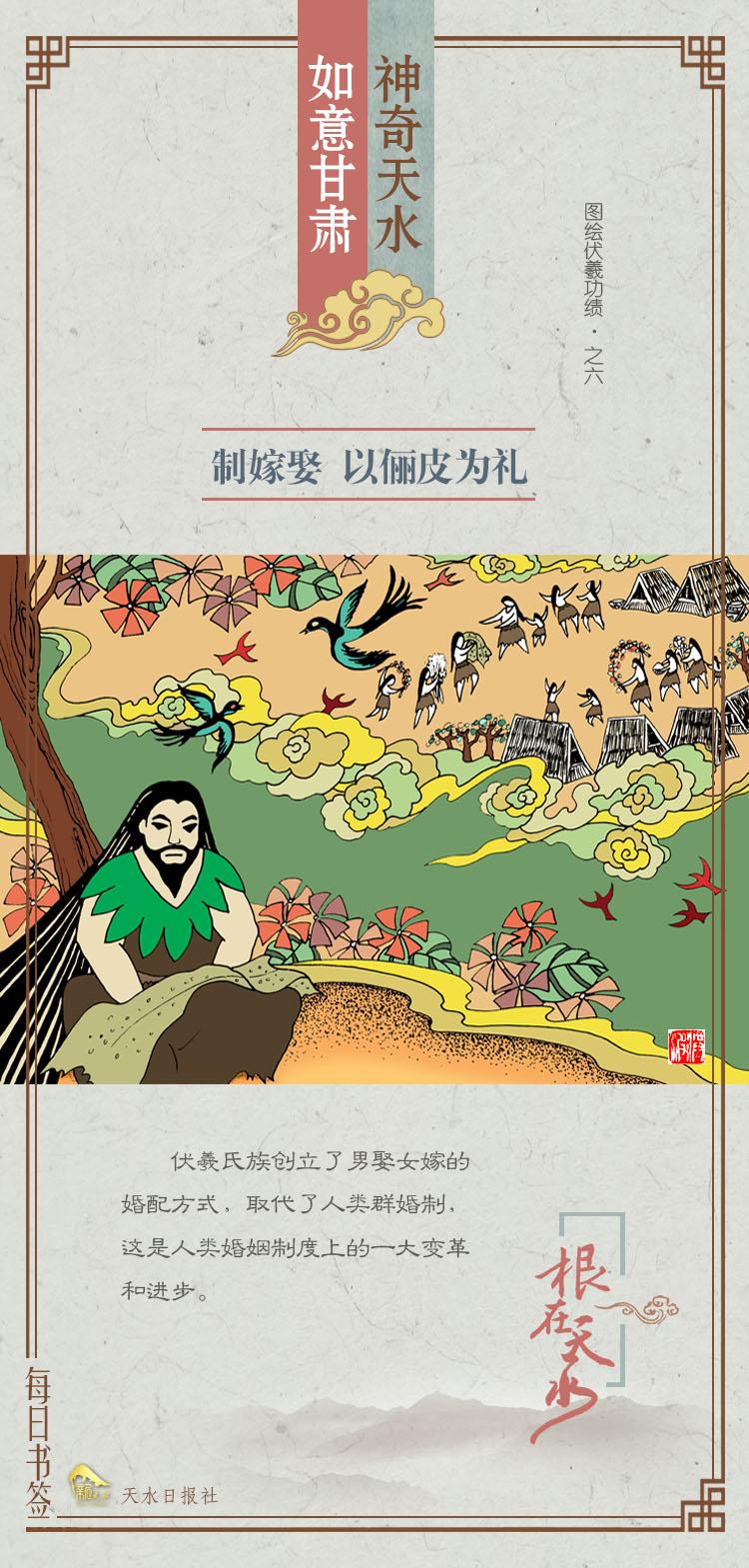 “根在天水”每日书签,以伏羲十四大功绩“始画八卦 肇启文明”“造书契 以代结绳之政”“结网罟 以教佃渔”“养育牺牲 以充庖厨”“造屋庐 改善居室”“制嫁娶 以俪皮为礼”“养蚕化布 改善衣着”“疏水造田 繁滋草木”“钻木取火 冶金成器”“制琴瑟 作乐曲”“尝百草 制九针”“以龙纪官 分部治理”“创立占筮之法”“作历度 定节气”为内容,将原创手绘插图设计制作成精美书签形式,艺术化表现伏羲时代的生活场景和对人类发展的伟大贡献,以此讲好伏羲故事,传承弘扬伏羲文化,进一步提升伏羲文化的影响力。