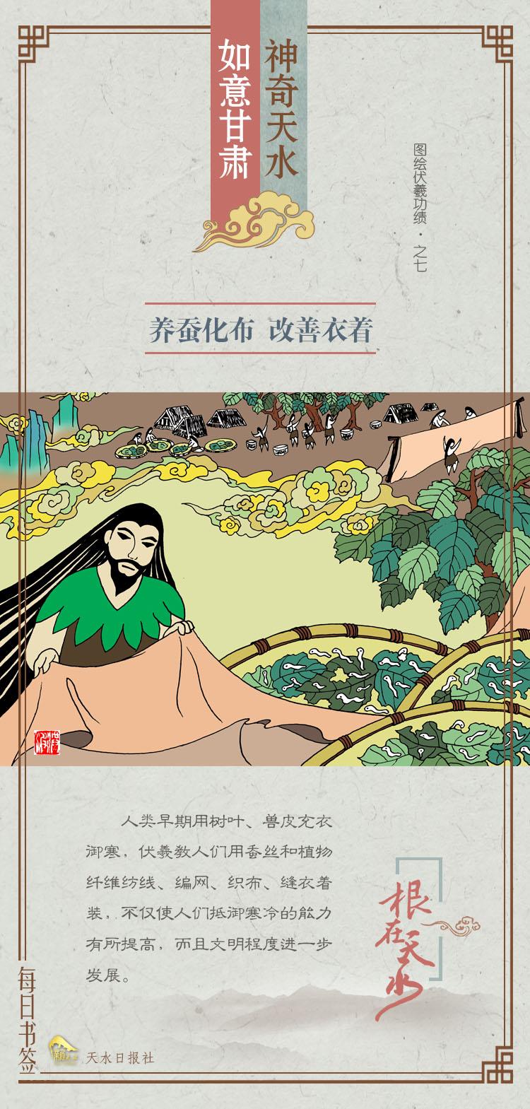 “根在天水”每日书签,以伏羲十四大功绩“始画八卦 肇启文明”“造书契 以代结绳之政”“结网罟 以教佃渔”“养育牺牲 以充庖厨”“造屋庐 改善居室”“制嫁娶 以俪皮为礼”“养蚕化布 改善衣着”“疏水造田 繁滋草木”“钻木取火 冶金成器”“制琴瑟 作乐曲”“尝百草 制九针”“以龙纪官 分部治理”“创立占筮之法”“作历度 定节气”为内容,将原创手绘插图设计制作成精美书签形式,艺术化表现伏羲时代的生活场景和对人类发展的伟大贡献,以此讲好伏羲故事,传承弘扬伏羲文化,进一步提升伏羲文化的影响力。