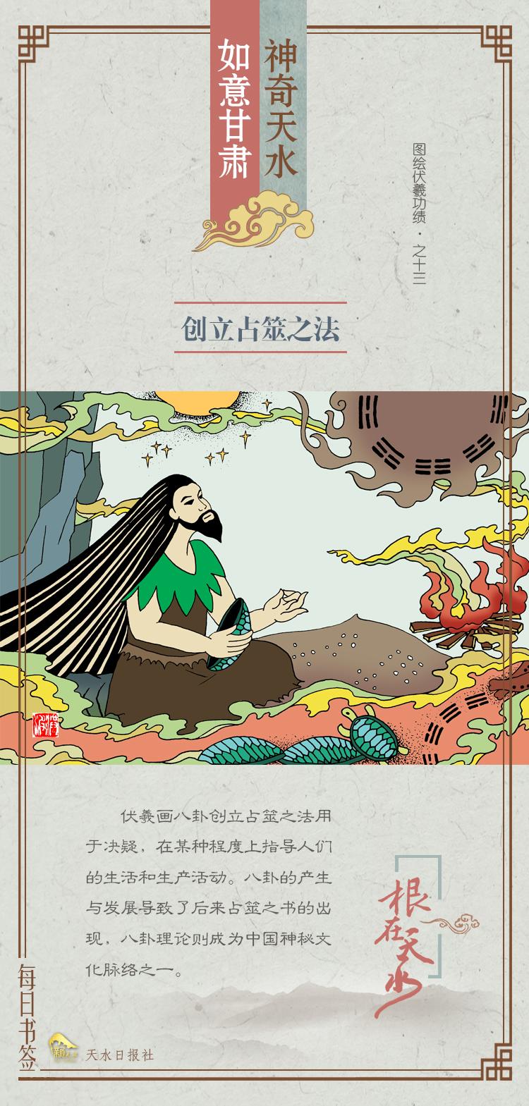传承伏羲始祖文化,擦亮伏羲文化品牌。伏羲文化源远流长,内涵丰富,精深奥妙,魅力无穷。为贯彻落实天水市第八次党代会提出的着力打造伏羲始祖文化传承创新区,以及我省《华夏文明传承创新区建设“十四五”规划实施意见》,天水日报社全媒体文化中心特别策划制作“如意甘肃 神奇天水”图绘伏羲功绩书签。