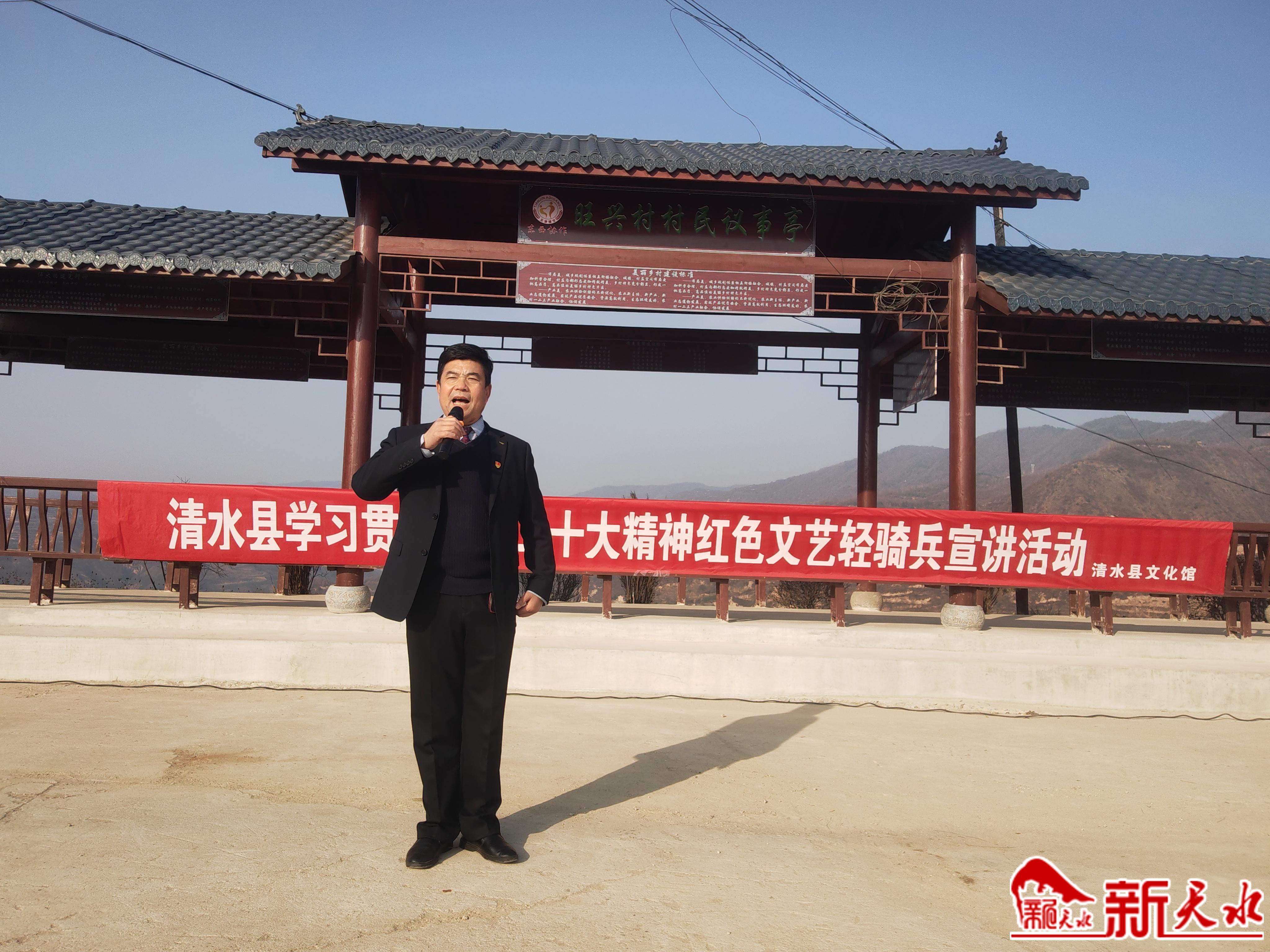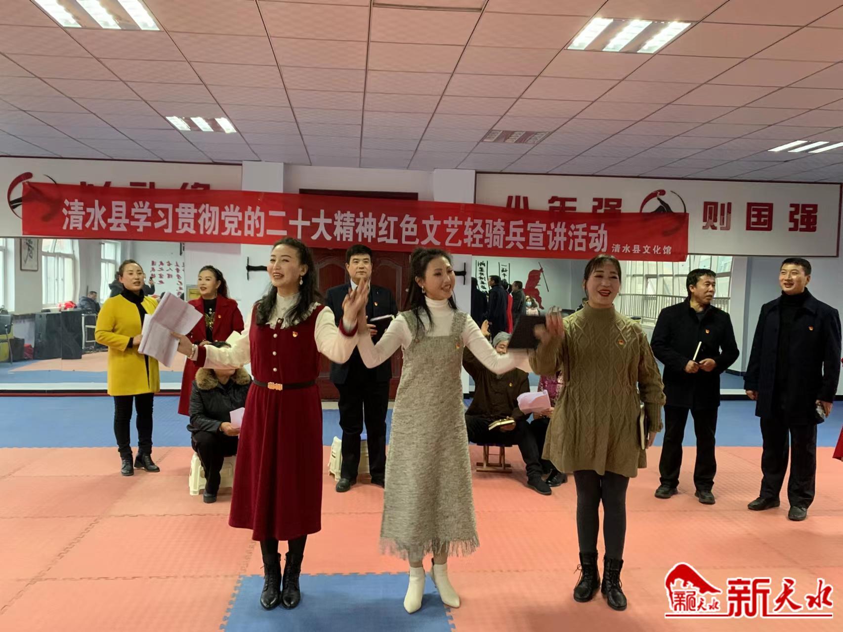 新天水讯【记者刘蕾】12月6日,清水县文旅局组织文化馆和秦剧团文艺小分队在永清镇城南社区、秦亭镇店子村、山门镇旺兴村举办了清水县宣传党的二十大精神红色文艺轻骑兵宣讲活动,通过群众喜闻乐见的方式,让党的二十大精神在基层落地生根,深入人心。