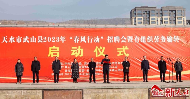 新天水讯 据武山县融媒体中心消息 1月31日,农历正月初十,武山县举行2023年“春风行动”招聘会暨有组织劳务输转启动仪式。县委书记王新强出席仪式并宣布“天水市武山县2023年‘春风行动’招聘会暨有组织劳务输转活动”启动,县委副书记、县长王志成,市人社局副局长吴晓萍出席仪式并讲话,劳务公司、用工企业负责人及外出务工人员代表分别发言,副县长李峰主持仪式。