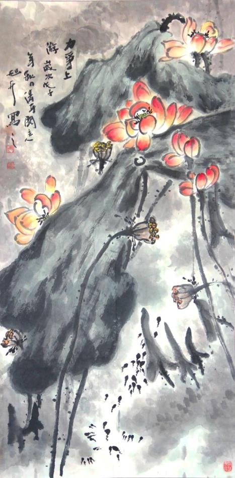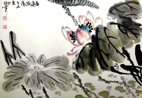 在花鸟画作品创作中,荷花是画家最具青睐的题材,因其“出淤泥而不染,濯清涟而不妖”的品格,赢得了“君子”花的美称,为世人所喜爱。赵旭升创作的《力争上游》,细细品味,虽水墨效果不太明显,但其构图奇巧,把荷花磊落不羁、坚韧孤傲的特点表现得淋漓尽致,充满自然天成。生机盎然的《香远益清》呈现得清纯而高洁,舒展的荷叶自然超逸,生命的底色显露得更加绚丽夺目。