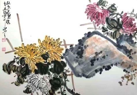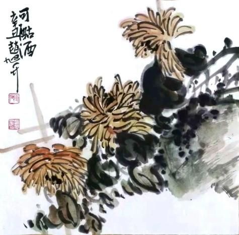无论在写生,还是创作过程中,赵旭升始终追求花鸟画笔墨的干练、简约。经过日积月累的自然观察,以及对自然物象的不断领悟,深深懂得花鸟草木的性情,并在作品中削其冗繁,得其神髓。我们在其《迎春》《牡丹国色一品香》中能够品读到画家深入生活、深入自然的创作理念,这些作品构图舒展稳定,花瓣层层叠叠,具有“一朵妖红翠欲流,春光回照雪霜羞”的感觉。画家用细腻的艺术手法,将国色牡丹画得格外丰润,清香氤氲,一种恬淡的意韵跃然纸上,令人赏心悦目。其《晚香高节》中的菊花,具有“且看黄花晚节香”的寓意。挺拔的竹子,节节高,疏密有致的竹叶,顺竹竿舒放。菊花、竹子依石而立,画面雅致清爽,一股清刚之气扑面而来,品之沁人心脾,同时也写出画家胸臆。赵旭升的《秋来色更佳》《可酤酒》《东篱秋色》,把菊花坚强不屈、气韵超逸、孤傲脱俗的精神品质,用艺术的手法再现给受众,耐人寻味。