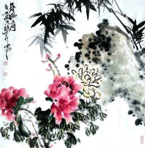 细观他创作的花鸟画《阳春三月》《嫣然墙角一枝梅》《桃花八哥图》《东篱秋色》等作品,我们能够欣赏到生动的花鸟形象,这些被艺术化的花鸟,画家以浓淡的笔墨赋予生命,栩栩如生。不难看出画家通过花鸟的自然形象,在创作过程中倾注了大量的情感,使得画面富有鲜活的生命律动。