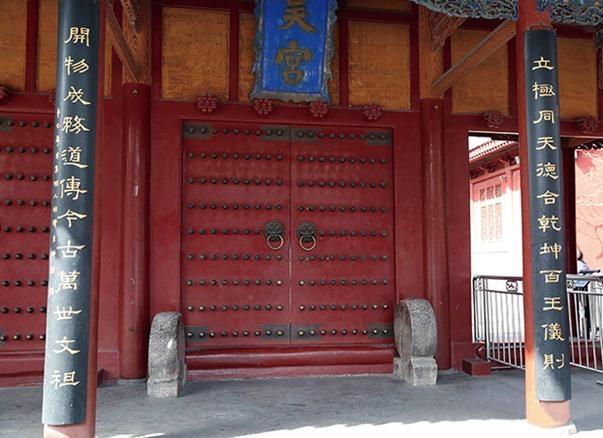 再看下联:开物成务,道传今古,百王仪则。《系辞传》曰:“夫《易》,开物成务,冒天下之道,如斯而已者也。”“开物成务”指通晓万物的道理,并按此道理行事而得到成功。“道传今古”,《系辞传》曰:“《易》兴也,其道甚大,百物不废。惧以终始,其要无咎。此之谓《易》之道也。”“道”同“开天明道”之“道”,即规律、法则,也就是《易经·说卦》所说的天道曰阴与阳,地道曰柔与刚,人道曰仁与义。“传”,传承。“今古”,从古到今。“道传今古”意思是,伏羲创造的八卦原理一代一代传承了下来,它永远是指导人们认识自然和人类社会的思想武器。“百王仪则”,南宋罗泌《路史》曰:“继天出震,肇修文教,为百王典。”“百王”,指历代帝王。“仪则”同“典”,引申为行为规范、准则之意。