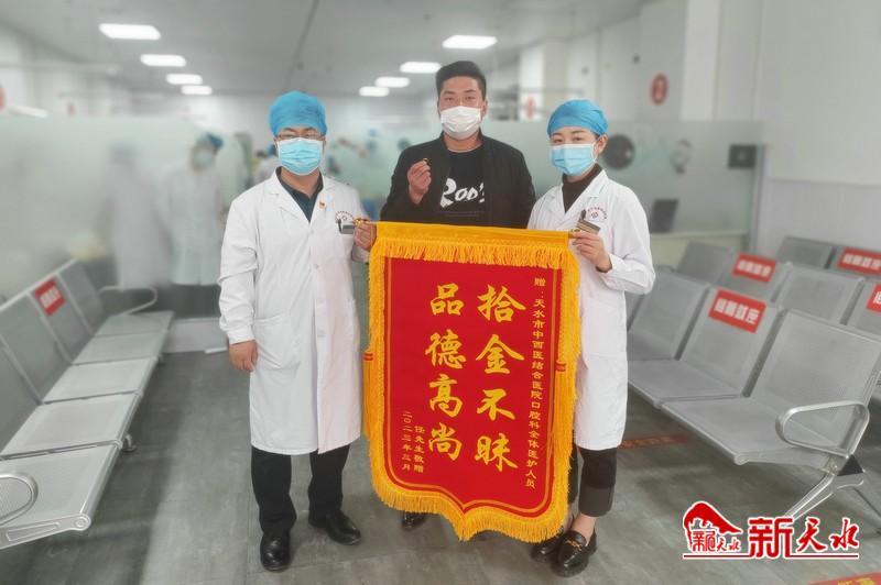 新天水讯 3月15日,一位男士来到市第二人民医院口腔科,将一面写有“拾金不昧 品德高尚”的锦旗送到护士徐文文手中,以表达感谢之情。