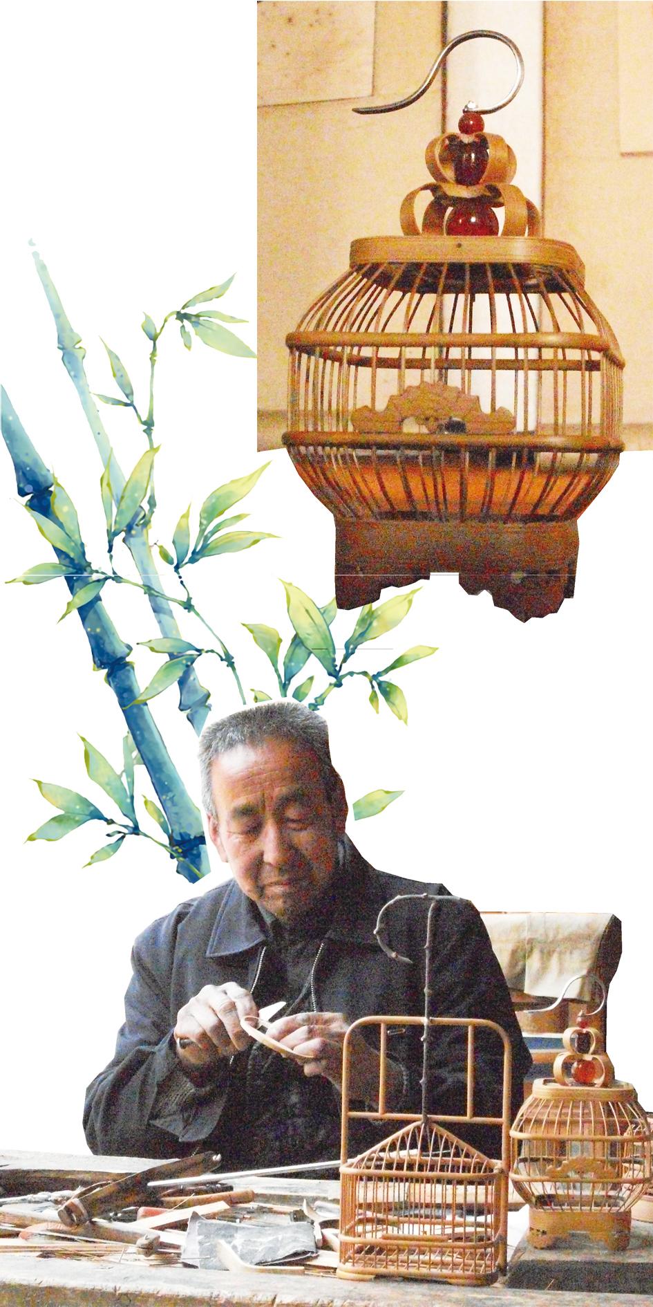 走进他家的厅堂,条案上摆满了各式各样的竹编鸟笼和蝈蝈笼,皆制作精美、工艺独到,他在有些地方增加了雕花,拓展了样式,使其更加美观。