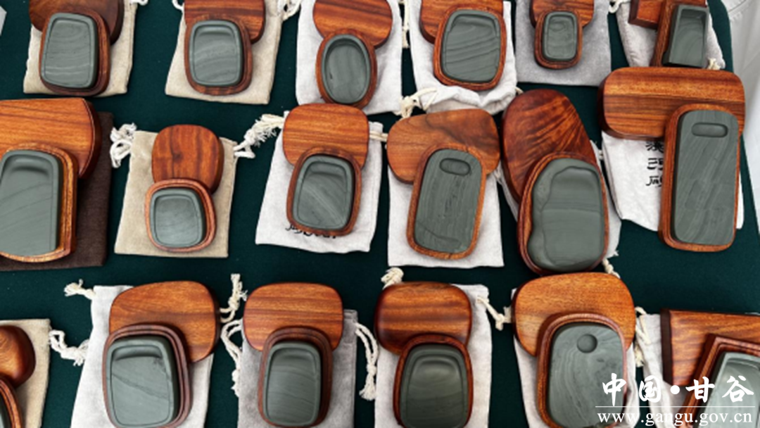 中国四大名砚之一的甘肃洮砚以其色泽碧绿、温润细腻的特点而著名,作为国家级代表性传承人卢锁忠的儿子,卢广成凭借在中央美院的学习功底,以现代明快的设计理念让洮砚实现创造性转化,打造了“文公子”洮砚系列产品,受到现场嘉宾和观众的青睐。庆阳香包古拙质朴、色彩浓郁,甘肃省级代表传承人刘兰芳将其传统元素与国潮内涵相结合,创作出“十二生肖”“虎头帽”等古典与潮流并行的文创产品。作为刘兰芳的儿子,庆阳歧黄文化传播有限公司负责人张煜琛头戴“虎头帽”,布展期间就被过往游客围观,买走了老虎枕头、香包挂饰等产品。