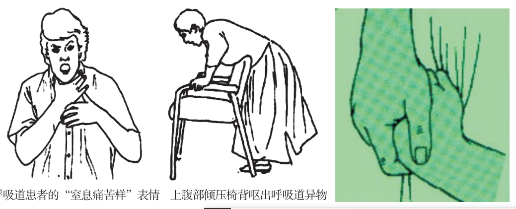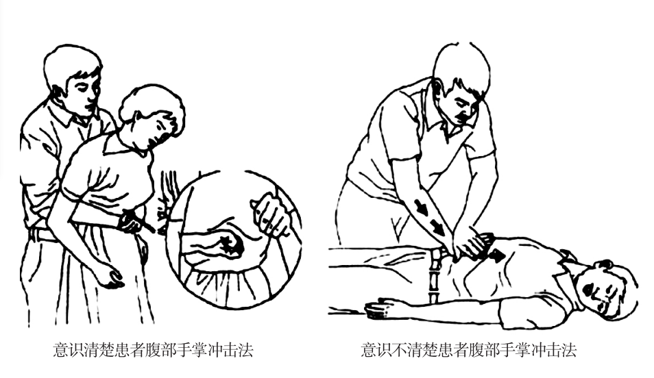 ②气道梗阻互救急救法:※患者表现出轻度气道梗阻症状,可鼓励继续咳嗽,严密观察是否发生严重的气道梗阻。※患者表现为严重的气道梗阻症状,但意识清楚,应进行背部叩击法。施救者站在患者身后,让患者身体前倾,施救者一只手支撑患者胸部,另一只手的掌根部在其两肩胛骨之间进行5次大力叩击;如果5次背部叩击不能解除气道梗阻,改用腹部冲击法。施救者站在患者身后双臂环绕患者腰部,让患者弯腰、头部前倾,施救者一手握空心拳,用拳头拇指侧抵住腹部剑突下,脐上腹中线部位,另一只手紧握此拳头,用力迅速将拳头向上、向内冲击5次,如果没有解除,继续交替进行5次背部叩击和5次腹部冲击,直到解除梗阻。