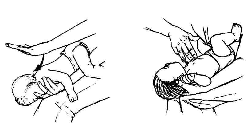 ④一岁以下的婴儿。施救者采取坐或跪的姿势,用大腿支撑使婴儿俯卧于手臂上,同时大拇指固定支撑婴儿的头,另外1或2个手指放在下颌的另一边,保持下颌的角度,不要挤压下颌软组织。用另一手的掌根部在肩胛骨之间给予5次快速的叩击。检查每次叩击背部是否解除了气道梗阻,如解除,不一定要做足5次。