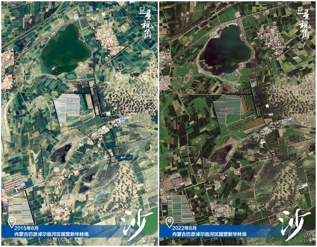 ↑2022年跟2015年相比,从卫星图上下部分看青海湖水体面积扩大。