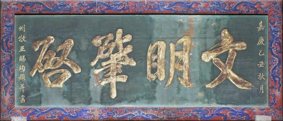 天水伏羲庙先天殿暖阁上方,有一块清代匾额,上书“文明肇启”四字。匾文绿底金字,上款为“嘉庆乙丑秋月”,下款为“州牧王赐均题并书”。四边框彩绘龙纹图案,红底蓝彩;上部中间为双龙戏珠纹,左右双龙相对;下部中间为海水仙山纹,左右双龙相对;两侧边为单翔龙,龙纹及周边间饰云朵,四角为火珠纹、折枝花卉纹。