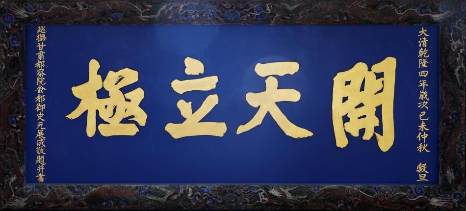 该匾悬于天水伏羲庙先天殿东侧门之上。长3.38米,宽1.6米,厚0.12米。匾文蓝底金字,上款为“大清乾隆四年岁次己未仲秋谷旦”,下款为“巡抚甘肃都察院佥都御史元展成敬题并书”。四边框有浮雕图案,上边框为双龙戏珠,间施云纹,下边框为双龙戏珠,间施海水纹,两侧边为翔龙和云纹图案。
