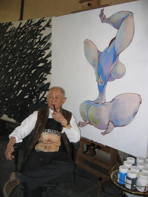 2007年4月28日上午,我随一群香港画家同去“万荷堂”拜望黄永玉。在他高大宽敞的画室里,一眼瞥见那一幅几近尾声的作品。绘画采用漫画的笔法,画的是一个肌肉健硕、腰肢纤细、手指和脚掌却枯槁骨感的裸体女子,跪着,背对着,两胳膊一上一下反拧过去,那动作与其说是在做瑜伽或伸懒腰,不如说是在洗澡搓背。