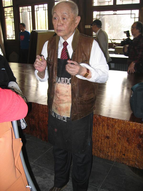 ▲黄永玉的“打扮”:白衬衣、红领带、类似围裙的齐膝的工作衣、无袖的短装皮夹克。江胜信 摄