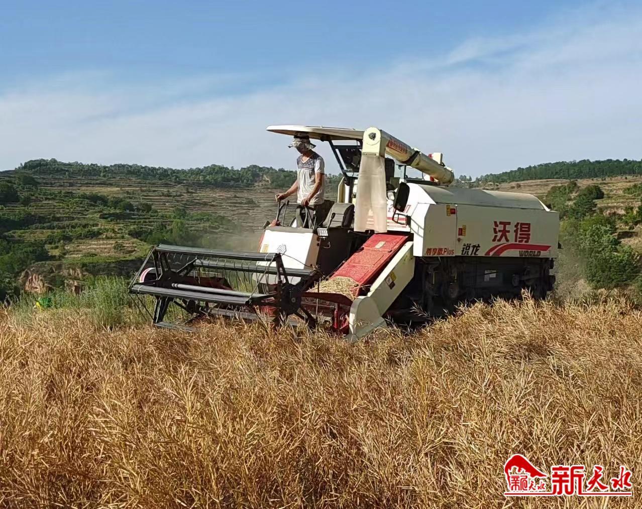 随着时序的推进,秦州区全域已经开始拉开夏收大幕, 18.4万亩冬油菜的丰收为秦州区的夏收赢得了开门红。 走在秦岭、牡丹、杨家寺等产粮乡镇的田间地头,随着 地势海拔的不同,各乡镇的冬油菜由东到西。由低到高 ,有的已经收割完毕,有的正在抢收。