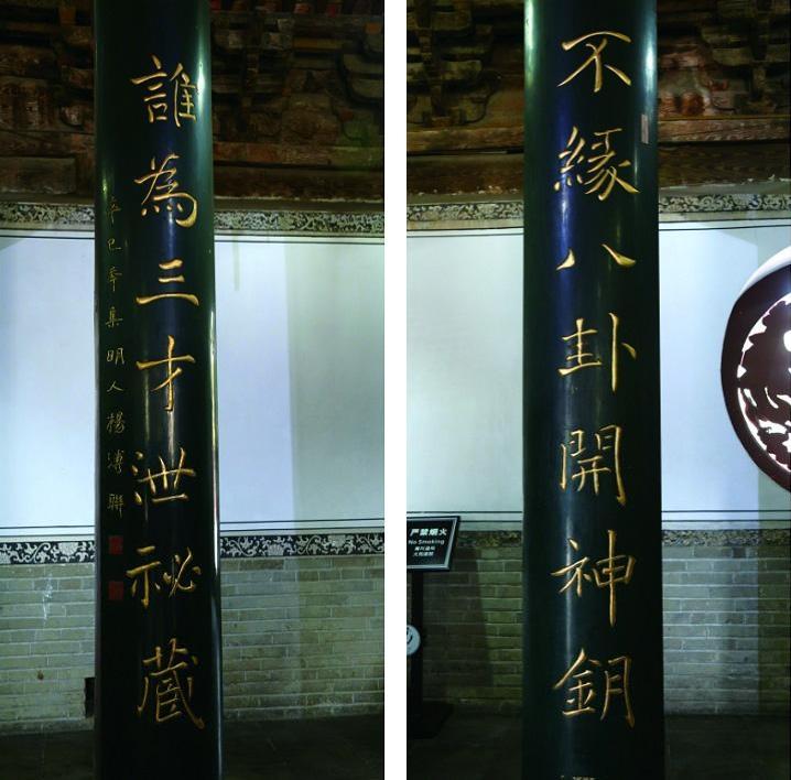 下联“谁为三才泄秘藏”中,三才:即《易》所讲的天、地、人。《说卦传》云:“昔者圣人之作《易》也,将以顺性命之理。是以立天之道,曰阴与阳;立地之道,曰柔与刚;立人之道,曰仁与义。兼三才而两之,故《易》六画而成卦;分阴分阳,迭用柔刚,故《易》六位而成章。”这段话译成现代汉语就是:从前圣人之所以作《易经》,就是要用它来理顺性与命的道理。所以,用阴与阳来阐明天道,用柔与刚来阐明地道,用仁与义来阐明人道,兼顾了天、地、人三才又各分为二,因而《易经》六个爻就成为一卦;分阴分阳,交替运用柔刚就成了一章。《系辞传》云:“六爻之动,三极之道也。”此句译成现代汉语就是:六爻的变动,揭示了天道、地道和人道的变化规律。泄:泄露。秘藏:此指六爻的变动能够让人们推知往事,预测未来之事。《系辞传》云:“圣人以此洗心,退藏于密,吉凶与民同患。神以知来,知以藏往,其孰能与于此哉!”这段话译成现代汉语就是:圣人用八卦囊括的法则来净化心灵,退隐于僻静之处,与民众共担吉凶。然其神可以预知未来,智可以涵盖往事,除了圣人,谁又能做到这些呢!