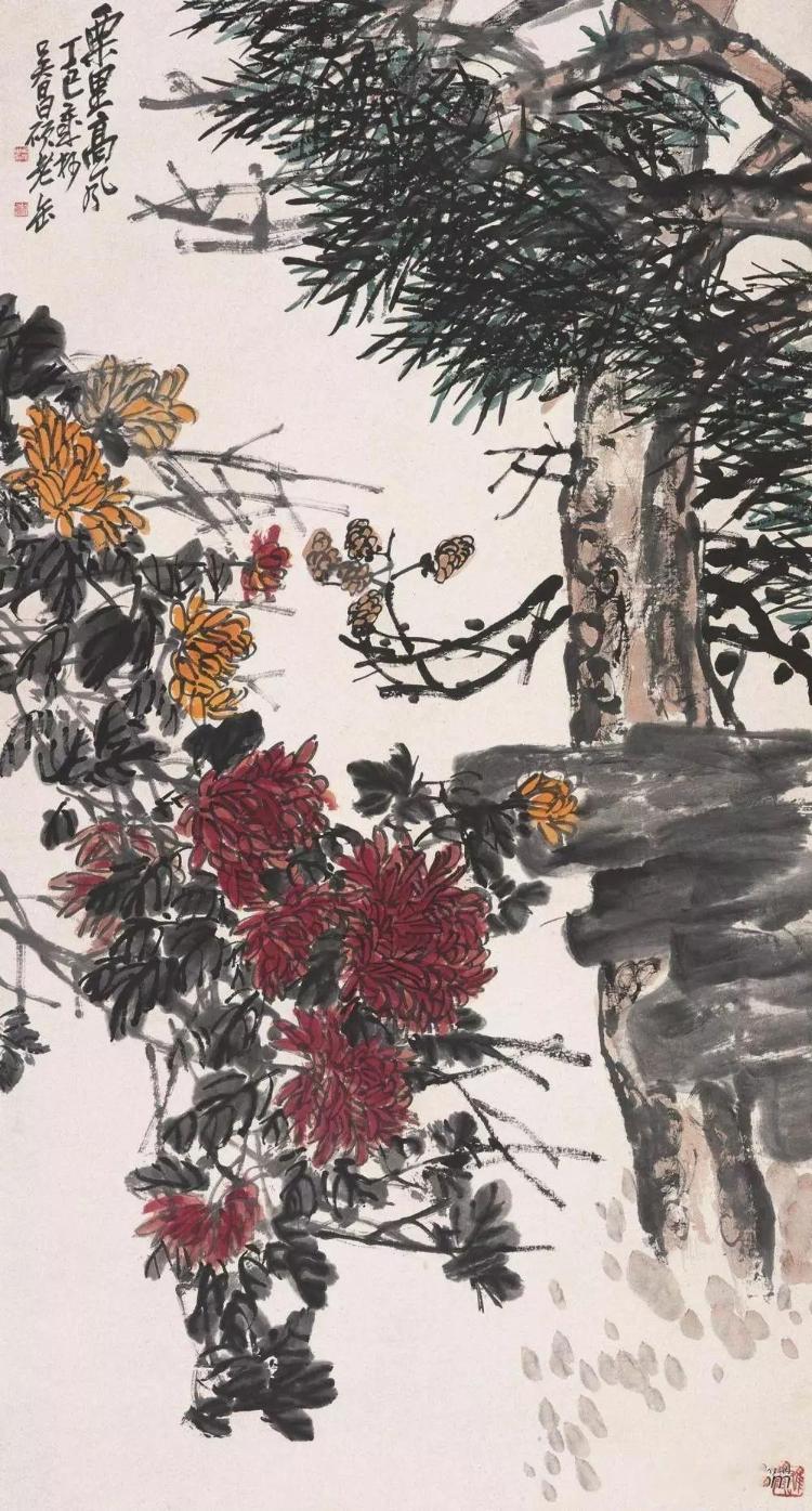 吴昌硕画菊更是抒发一种情怀。他16岁时,因为战争全家避乱于荒山野谷中,后与家人失散,先后在湖北、安徽等地流亡数年。吴昌硕通过画菊表达他不愿寄人篱下的高傲精神,因为菊花凌霜傲雪,于众芳谢后迎风盛开,五色缤纷。他在题诗中说:“秋菊灿然白,入门无点尘。苍黄能不染,骨相本来真。”“枝瘦能傲霜,孤高夐无偶。”他在《东篱佳色》题诗中感慨道:“既有隐逸名,何须寄篱下?惯受风雨欺,秋来摘盈把。”吴昌硕的《栗里高风图》表明了自己的风骨,画面上一簇簇颜色各异、正在盛开的菊花扑面而来,右方岩石后面一棵松柏苍劲挺拔、高耸入云,苍松与菊花相互辉映,仿佛要与严霜进行一番斗争。右下方凝重的湖石与左下方下曳的红菊形成动与静的强烈对比,分外精神,更显出此画的无限气势和大自然的勃勃生机。此画是吴昌硕以傲菊、劲松赞叹陶渊明“不为五斗米折腰”的高风亮节,更是对自己当年“弃官先彭泽令五十日”的自况。吴昌硕在56岁那年经人举荐出任安东(今江苏涟水)县令,为官仅一个月便挂冠南下,从此绝意仕途,潜心艺术。他有一方闲章“弃官先彭泽令五十日”,表达其不愿阿谀奉承、鱼肉乡民,仰慕陶渊明怀瑾握瑜的心情。他晚年曾作《傲霜图》,图中用淡墨擦出两方巨岩,岩石右侧横陈着几枝粗壮的菊枝,几束盛开的菊花列于岩石前。菊花以浓墨勾出,显出无比的苍劲郁勃,表现了特有的深沉,既傲且庄的形象跃然纸上。他题诗:“南山高百丈,探秋时一上。篱花开烂漫,霜气更萧爽。寒香晚更奇,啸傲寄真想。根下丹泉流,泉甘菊苗长。”表达了自己矢志不渝的终身追求,并寄寓充满生机的未来。