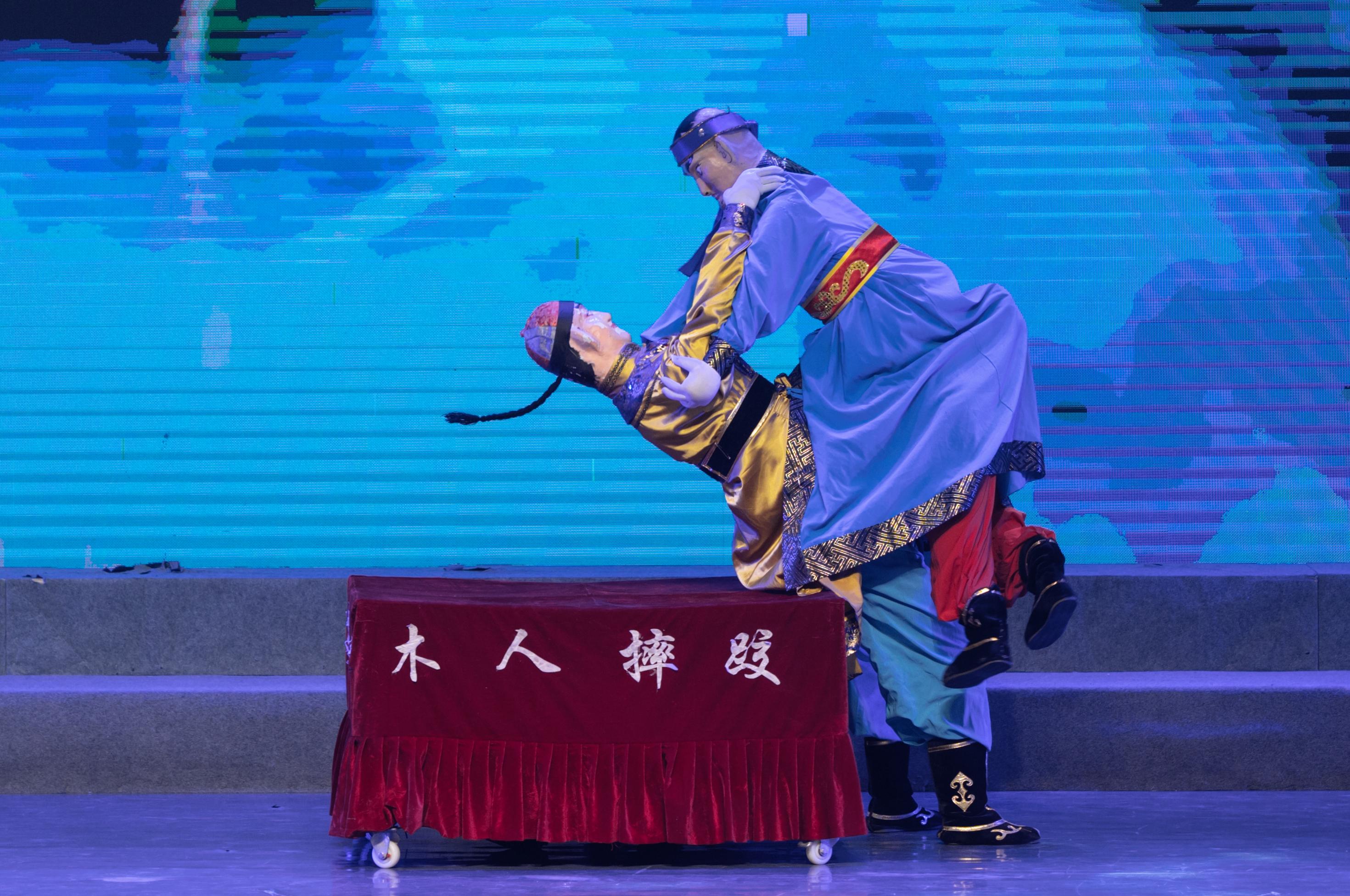 “一人演两人,难解又难分,自己摔自己,脚下定乾坤。”缑红斌从小在父亲的熏陶下酷爱戏曲,13岁便登台演戏,16岁正式学习曲艺表演,他练功格外刻苦,别人练一小时,他练三小时,从小便打下了良好的戏曲功底。表演清水木人摔跤要求形神皆备,演员要背驮四十多斤重的道具,需要练习者有较好的戏曲、武术功底,还要身体灵活,表演者通过一定的套路和技巧,利用推、踢、绊、翻、旋、摔、扫、托举等动作,互踢互绊扭打在一起,难度很大。为了表演好清水木人摔跤,缑红斌每天都练习“摔跌”。因为经常在水泥地板上练习,缑红斌身上经常摔得青一块紫一块的。但这些却没有吓倒缑红斌,因为不管天气如何,他的表演都不会中断。冬天还好,但在酷暑,露天的表演场地,三十多度的高温,缑红斌照旧驮着沉重的道具演出。因为害怕在演出过程中,汗水流到眼睛里,看不见脚下的方寸之地出现失误,每次演出,缑红斌都会用一条毛巾把头整个包起来,经过他的刻苦练习,他很快便掌握了表演木人摔跤的技巧,从此便一发不可收拾。这一路,缑红斌是摸爬滚打过来的。