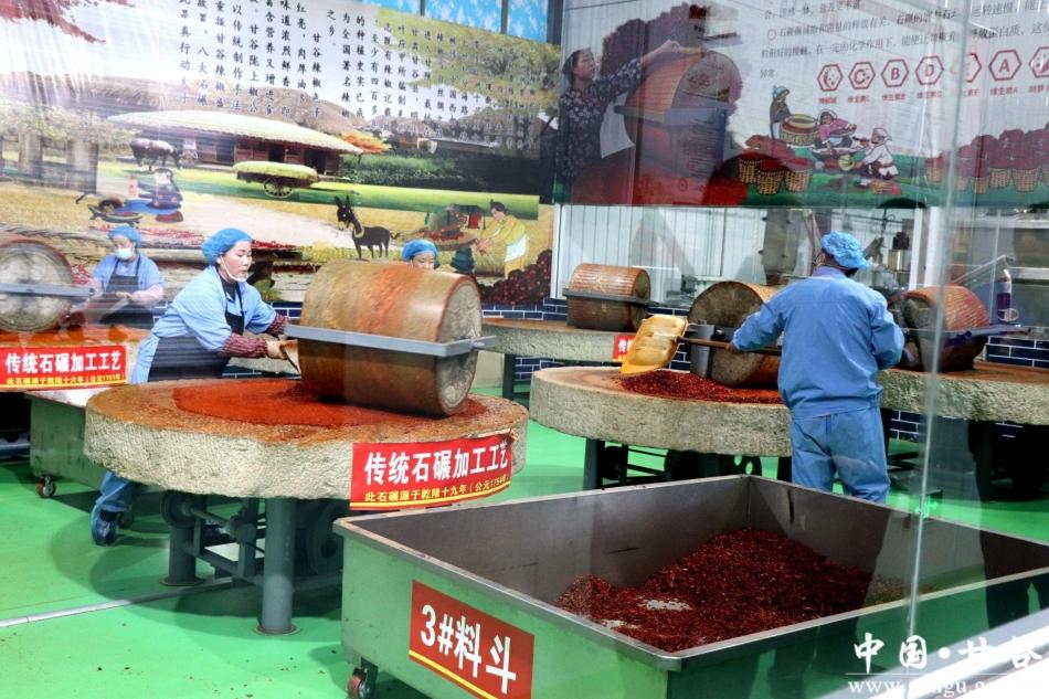 在辣椒红了专业合作社的辣椒面碾制车间里,可以看到四五个石碾子不停地转着,手拿小笤帚的工人跟着石磨转着圈。见惯了调味品市场加工调料时的小型机械粉碎场面,这种像石杵、石臼、石碾重新派上用场的加工场面让在场的参观者们眼前一亮。