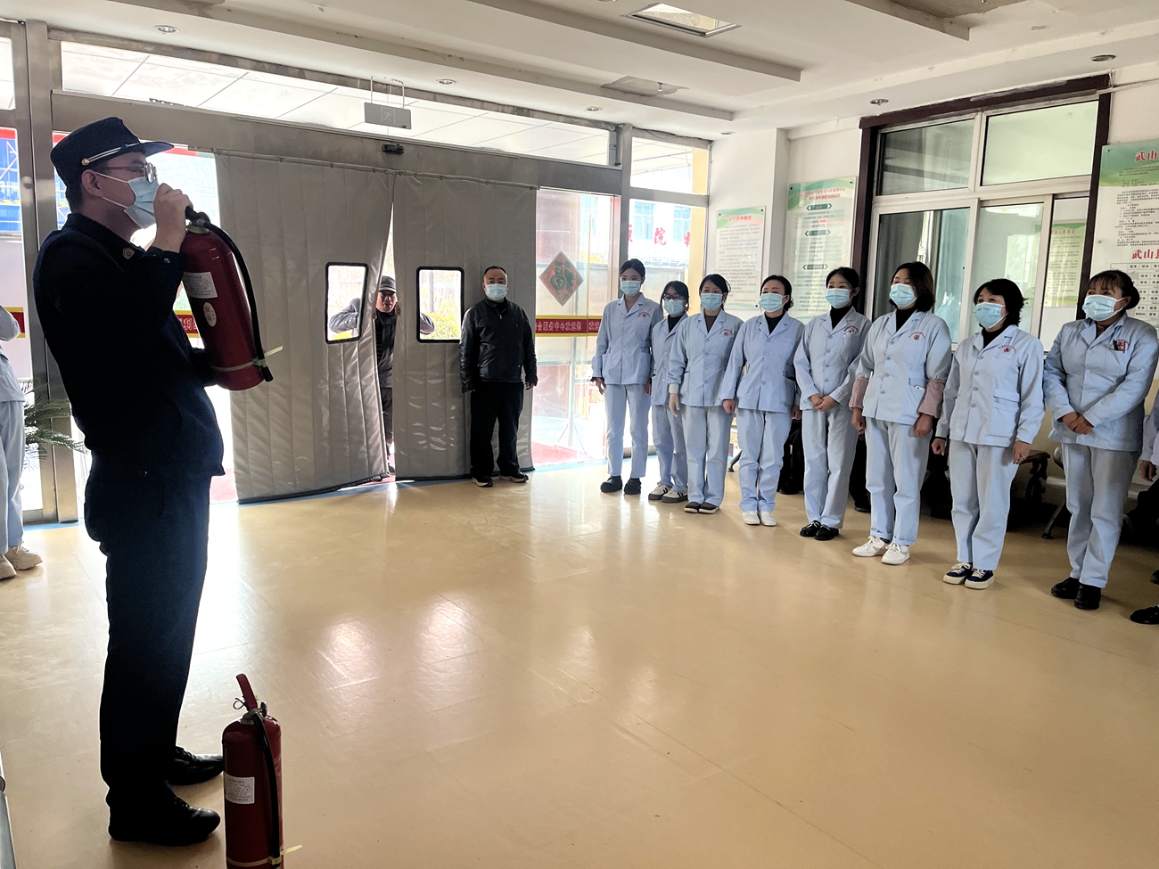 随后,在大队宣传人员的指导下,开展了消防应急演练。演练假设养老院某区域发生火情,警报声拉响。工作人员迅速响应,第一时间启动应急预案,按照预定的疏散路线,有条不紊地组织老人沿安全通道进行有序撤离。此外,参训人员还亲手操作灭火器,认真学习并熟练掌握“提、拔、握、压”的正确使用方法,切实做到在关键时刻不仅“会用”,更能“敢用”,有效提升了应急处置能力。