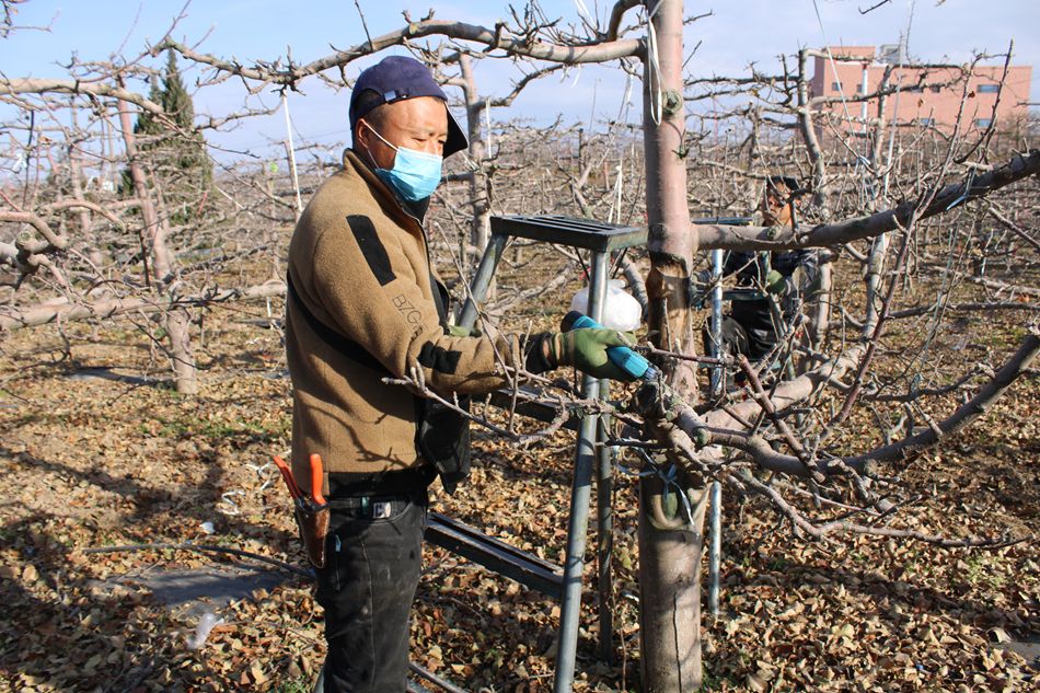 冬剪工作如火如荼,冬季抹药、浇灌封冻水等管护关键环节也在同步推进。与传统“开沟漫灌”的粗放模式不同,今年基地采用了更加高效的浇灌方式——柔性水带铺设在树行之间,以扇形喷洒的细密水雾均匀浸润树盘土壤。